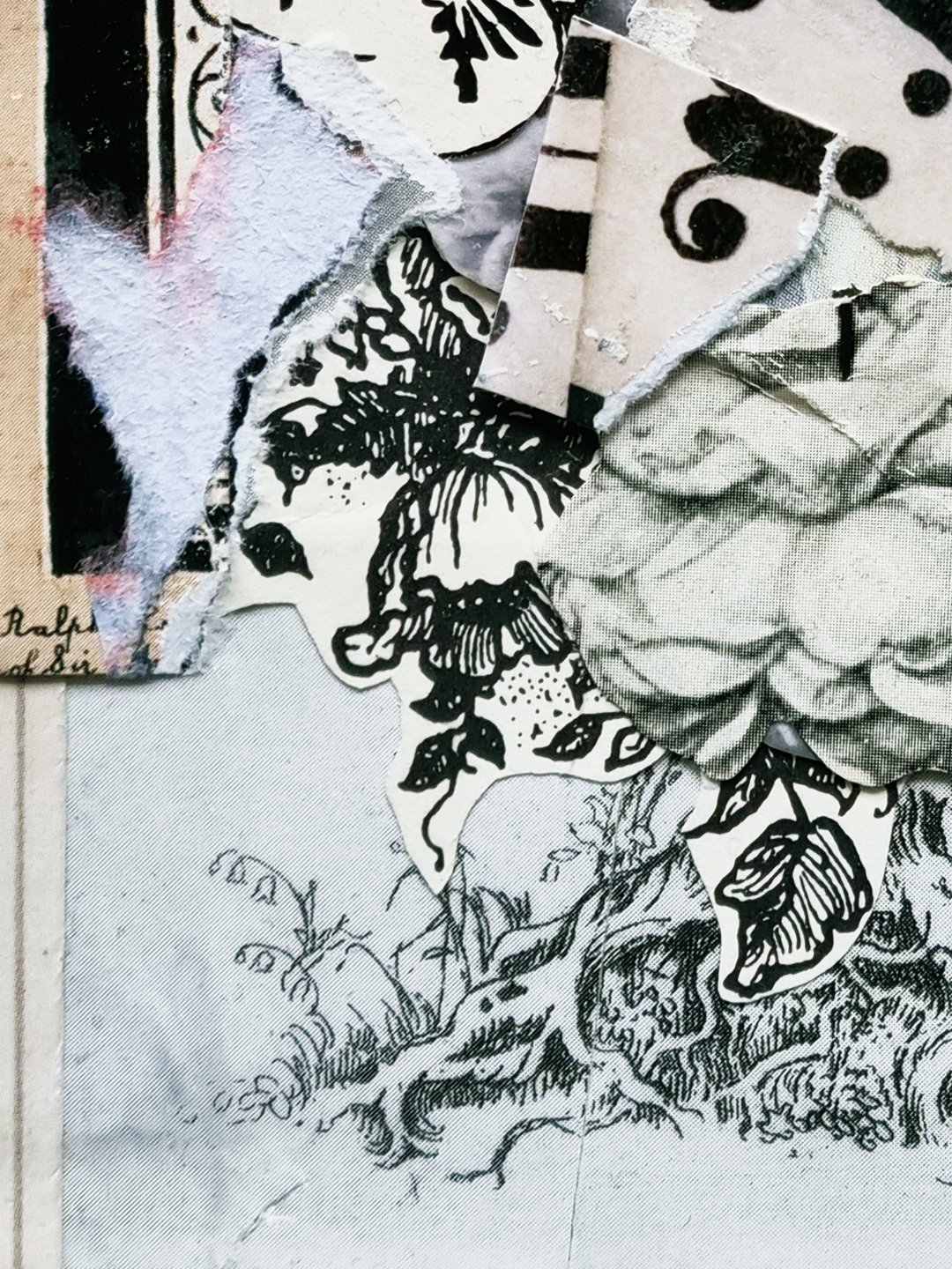 The collage works in the series are A6 – classic postcard size – and carefully constructed of intricate paper layers; art book cutouts, antique ephemera, vintage magazines, handmade tissue, beautiful scraps, and the amazing @commonsourcecollage.