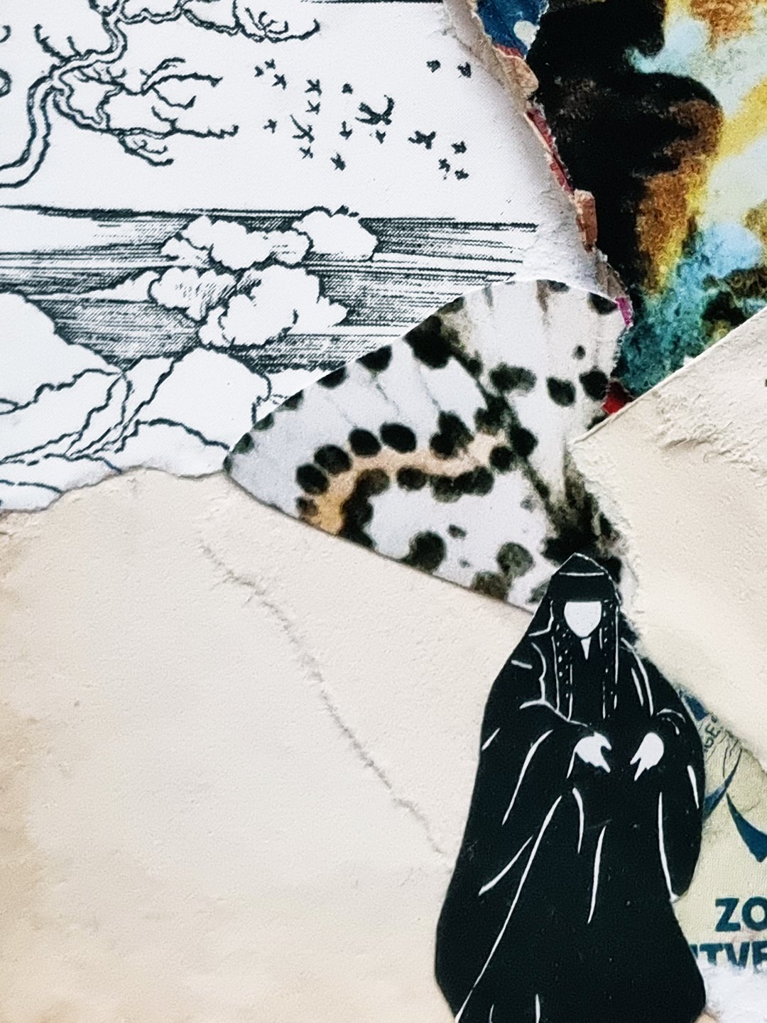 The collage works in the series are A6 – classic postcard size – and carefully constructed of intricate paper layers; art book cutouts, antique ephemera, vintage magazines, handmade tissue, beautiful scraps, and the amazing @commonsourcecollage.