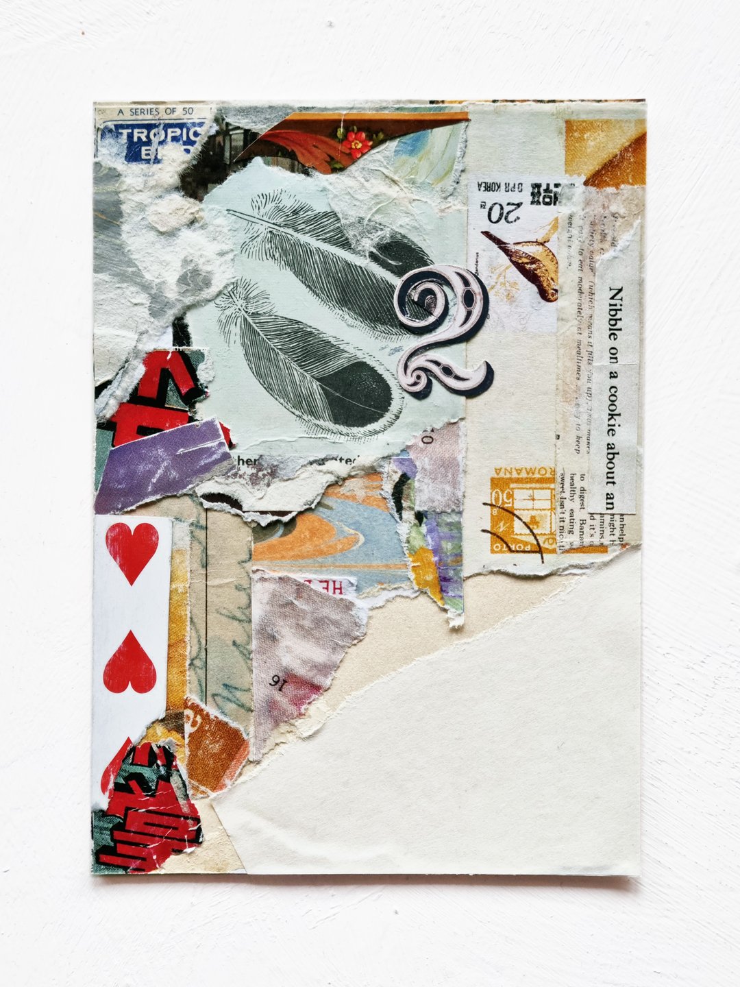 The collage works in the series are A6 – classic postcard size – and carefully constructed of intricate paper layers; art book cutouts, antique ephemera, vintage magazines, handmade tissue, beautiful scraps, and the amazing @commonsourcecollage.