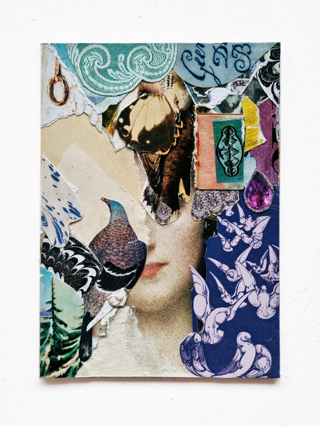 The collage works in the series are A6 – classic postcard size – and carefully constructed of intricate paper layers; art book cutouts, antique ephemera, vintage magazines, handmade tissue, beautiful scraps, and the amazing @commonsourcecollage.