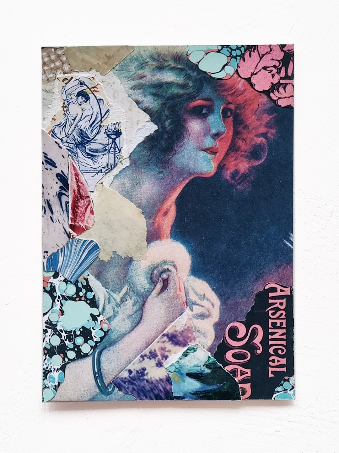 The collage works in the series are A6 – classic postcard size – and carefully constructed of intricate paper layers; art book cutouts, antique ephemera, vintage magazines, handmade tissue, beautiful scraps, and the amazing @commonsourcecollage.