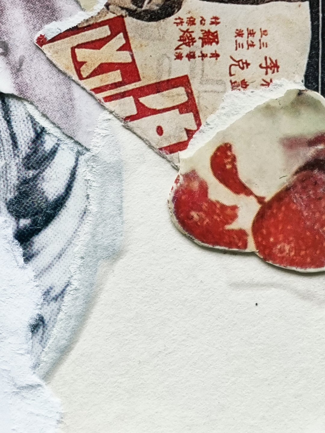 The collage works in the series are A6 – classic postcard size – and carefully constructed of intricate paper layers; art book cutouts, antique ephemera, vintage magazines, handmade tissue, beautiful scraps, and the amazing @commonsourcecollage.