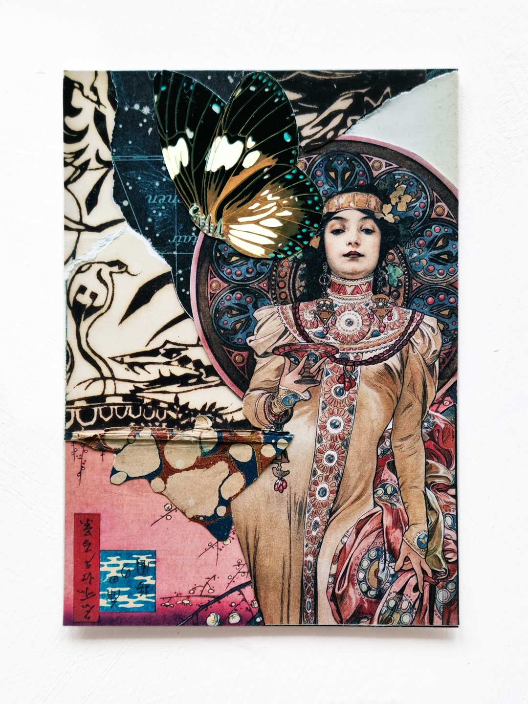 The collage works in the series are A6 – classic postcard size – and carefully constructed of intricate paper layers; art book cutouts, antique ephemera, vintage magazines, handmade tissue, beautiful scraps, and the amazing @commonsourcecollage.