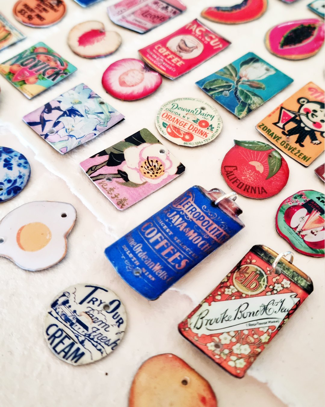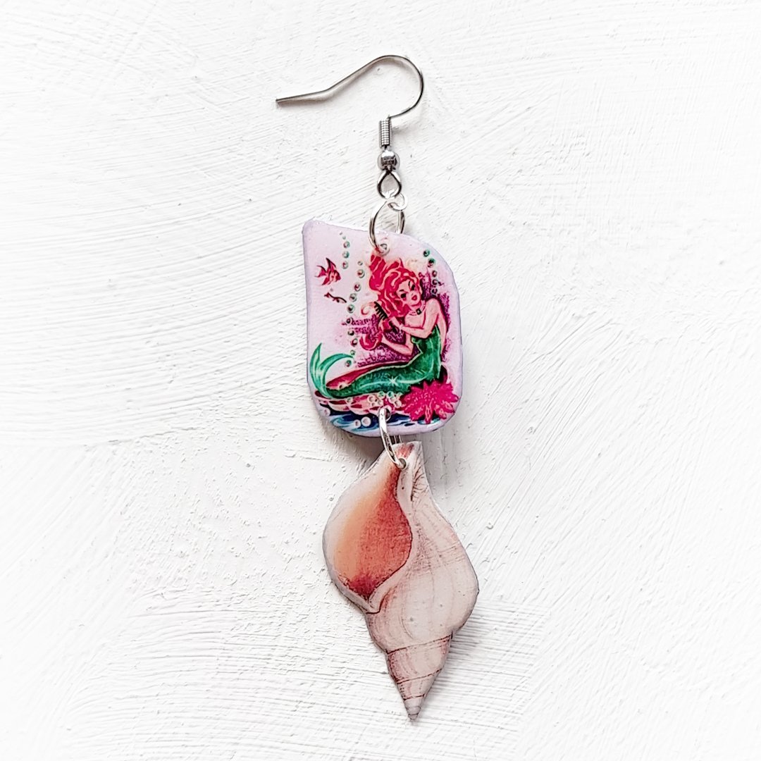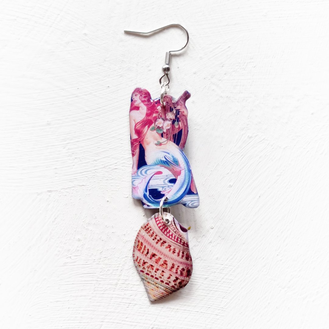 Lovingly designed and created by hand, with stainless steel findings. Dangling collage elements measure 2cm in width and around 7.5cm in length; 9.5cm total length with ear hooks included. 🧜🏻♀️